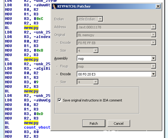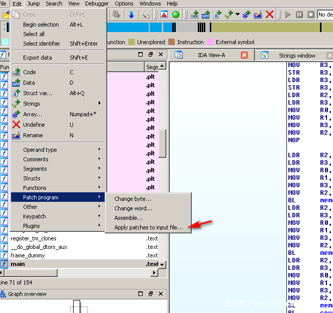 具体的使用,注意如果第一次使用keypatch之后没有Apply patches to the file就关闭IDA了,之后每次都会保存失败: