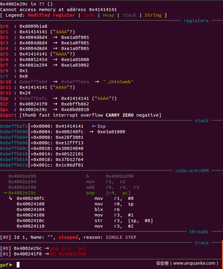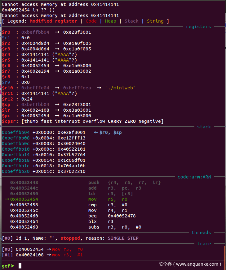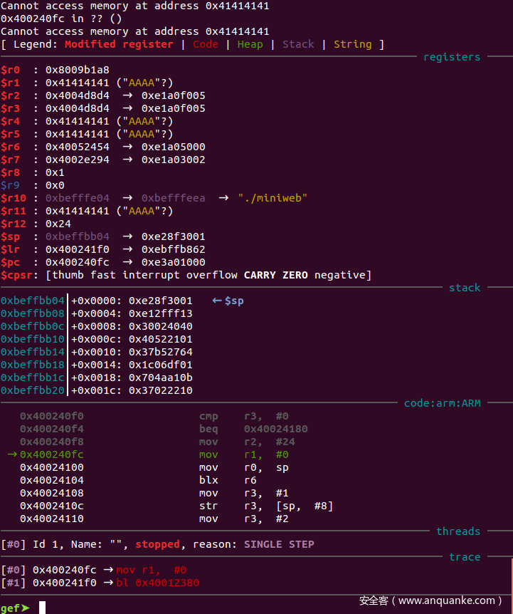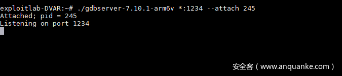 ./gdbserver-7.10.1-arm6v *:1234 —attach miniweb_pid