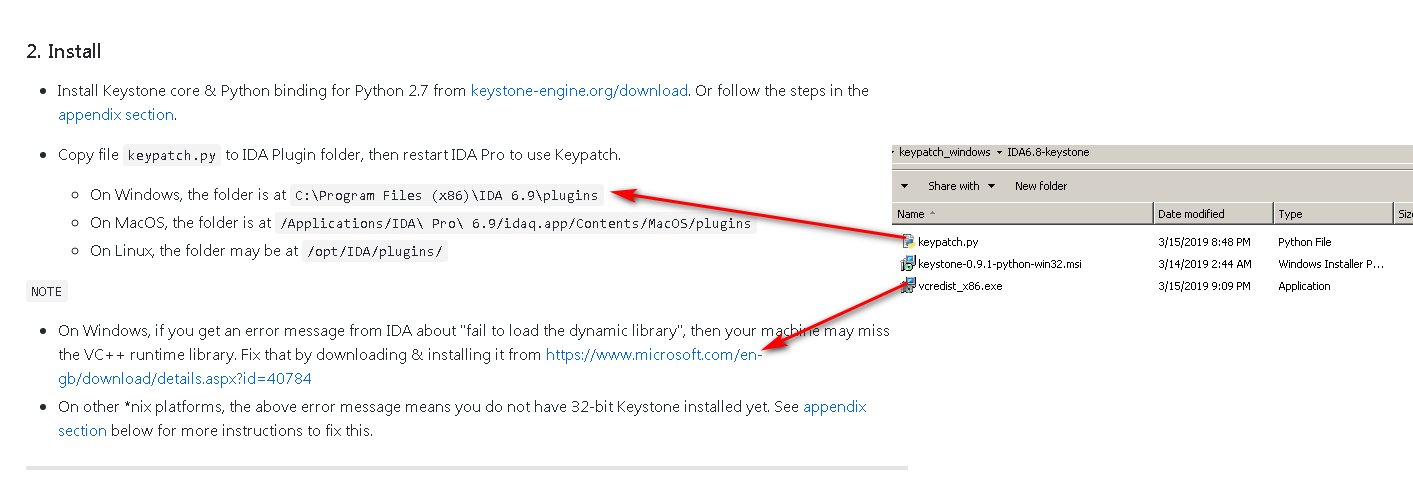 注意:vcredist_x86.exe,keystone-0.9.1-python-win32.msi都应该是同平台