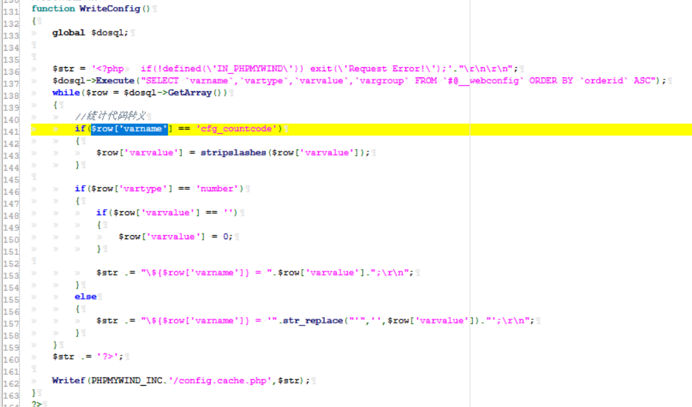 我们先来看这个函数里面的两个if,第一个if他的作用就是判断数据表里面的字段varname如果读出来是cfg_countcode的时候将那条数据的varvalue所对应的值删除反斜杠然后赋值给$row[‘varvalue’]