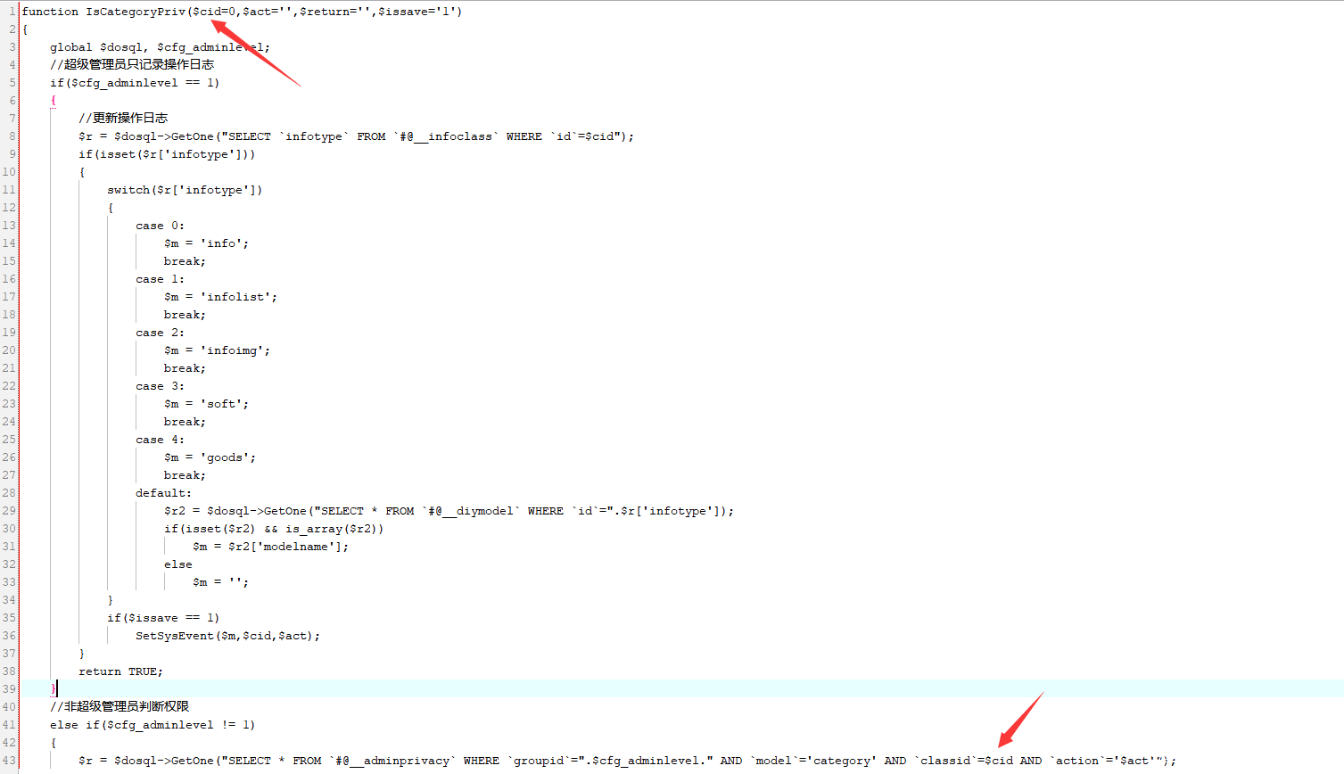 然后我们会发现这里实际上是调用了IsCategoryPriv函数传参所没有初始化并且拼接进的SQL语句没用使用引号包含造成的SQL注入。使用了这个函数,然后传参没用初始化的文件也有好多。