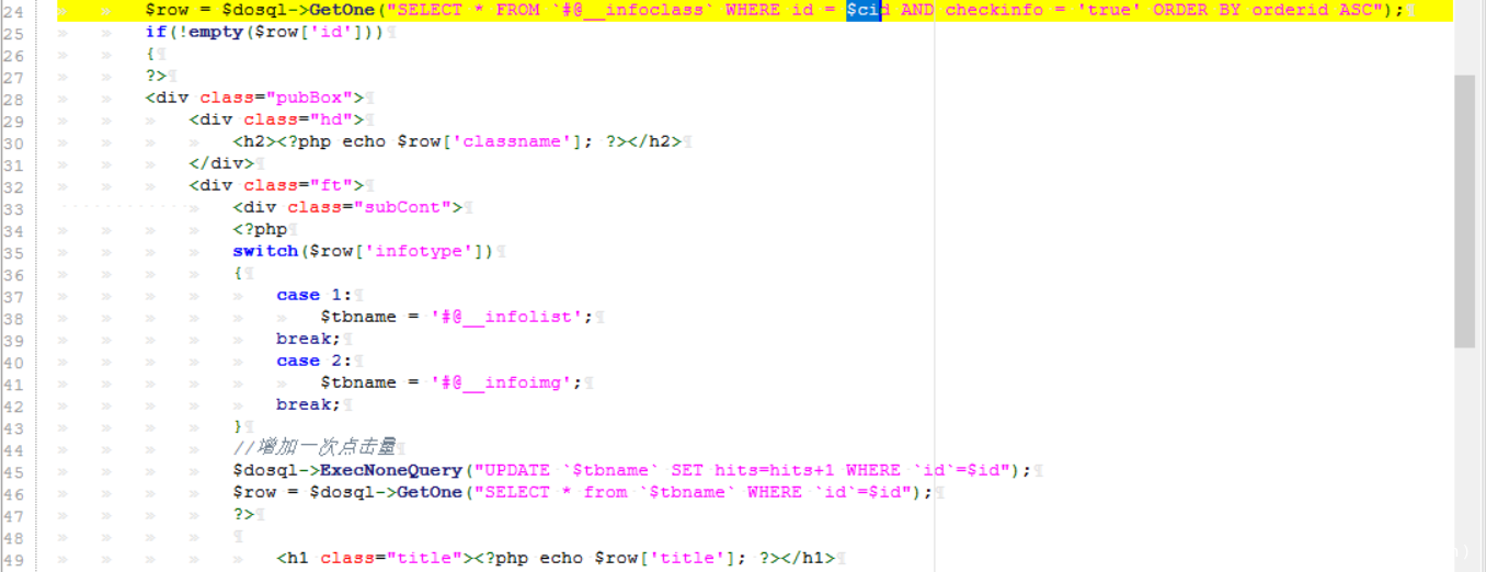 很明显这里24行是通过SELECT * FROM `#@__infoclass` WHERE id = $cid AND checkinfo = ‘true’ ORDER BY orderid ASC去获取$row,我们传参cid他就会去读取