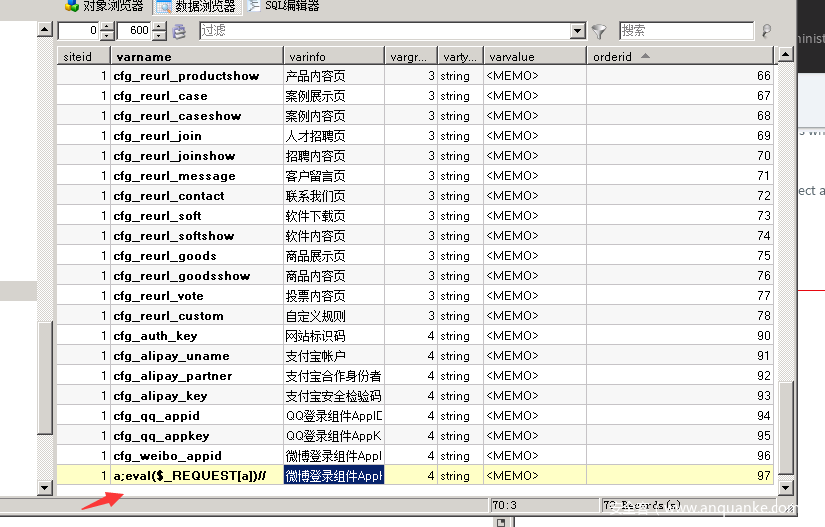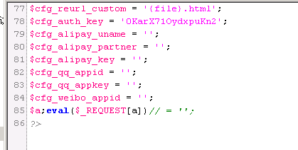 很明显有一句话木马,然后注释了后面,语法也没用问题。那么核心就是两个,第一个是控制这个$row[‘varname’],控制这个字段很明显就是修改数据库里面的内容呗。后台功能里面就提供了一个更新数据库的功能,我只需要执行