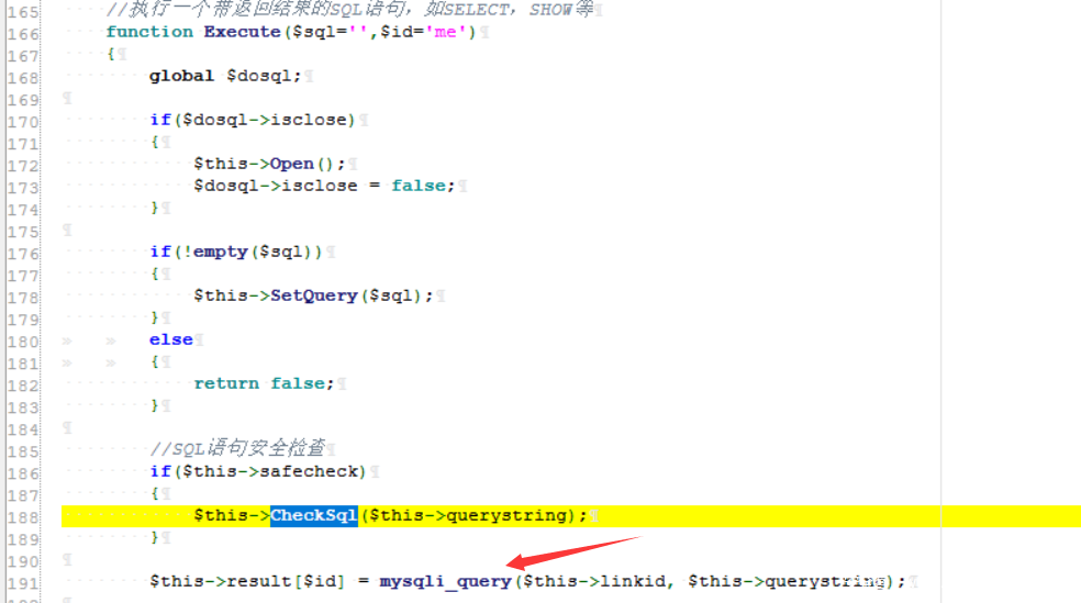 SetQuery函数是替换表名的前缀,然后Execute才是真的执行语句函数,然后们追踪这个函数,他的定义在mysql.class.php这个文件的第165-191行