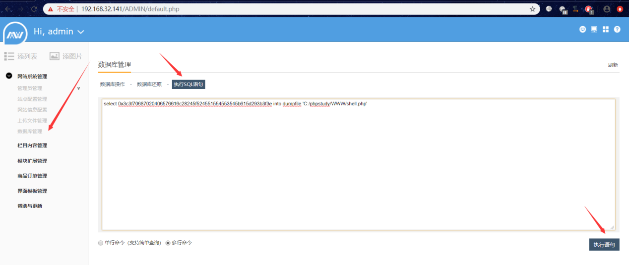 直接访问后台页面,然后选择数据库的执行SQL语句就行