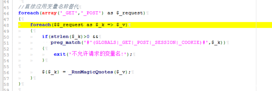 再看下面45-58行,这看着感觉很像$$的变量覆盖漏洞,实际上这里时一个方便开发的机制,可以让我们的传参全部都变成变量使用,例如我传参a=123。