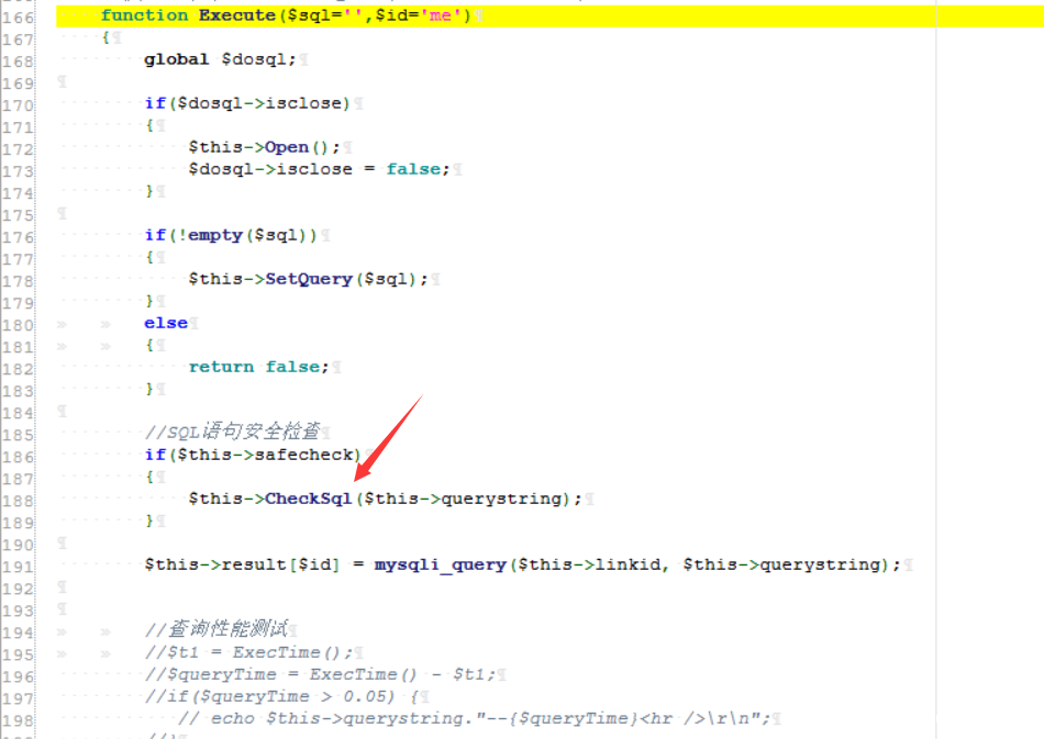 很明显这的第191行是执行,但是这里很明显要过一个CheckSql的检测。