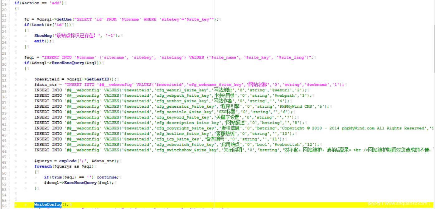 查看后台的site_save.php文件。我们看13行-56行这个分支代码,第56行有一个函数我们来看看是什么作用。
