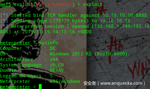 然后在web机上搭建一个简易的web服务,然后使用msf生成一个正向的shell,在cs下使用wmi用cmd使用certutil下载文件,并执行,msf收到域控的session