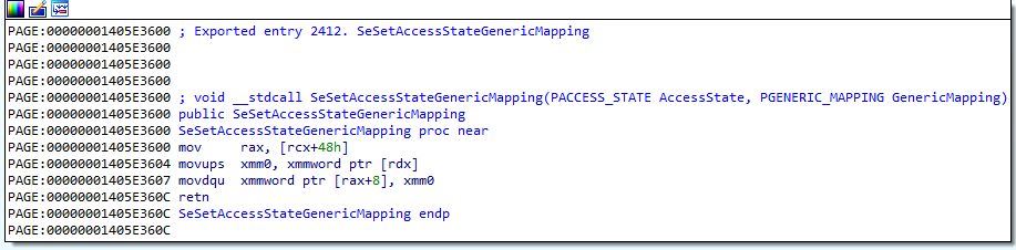 在寻找一些小函数,根据给定的约束执行操作之后,我们找到了一个合适的对象:nt!SeSetAccessStateGenericMapping。