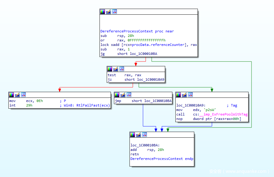 DispatchClose函数也打补丁了,新版本将调用从nt!ExFreePoolWithTag改变到DereferenceProcessContext,这表示,有时(如果引用计数不是零)“procData”不会被释放,只会将其引用计数递减一。