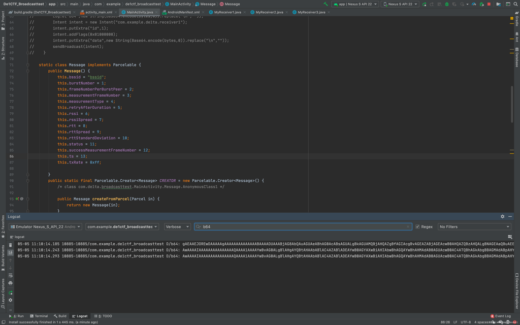 adb shell am broadcast -n com.de1ta.broadcasttest/.MyReceiver1 -a com.de1ta.receiver1 -f 32 --es data gAEAAEJOREwDAAAAAgAAAAAAAAAAAAAABAAAADUAAABjAG8AbQAuAGUAeABhAG0AcABsAGUALgBkAGUAMQBjAHQAZgBfAGIAcgBvAGEAZABjAGEAcwB0AHQAZQBzAHQALgBNAGEAaQBuAEEAYwB0AGkAdgBpAHQAeQAkAE0AZQBzAHMAYQBnAGUAAAAFAAAAYgBzAHMAaQBkAAAAAQAAAAMAAAAMAAAAAgAAAAsAAAAEAAAABQAAAA0AAAAAAAAABgAAAAcAAAD/////CAAAAAAAAAAKAAAAAAAAAAkAAAADAAAAAwAAAAMAAAASAAAAEgAAABIAAAAYAAAAAwAAAAQAAAAFAAAABgAAAAcAAAAIAAAACQAAAAoAAAALAAAADAAAAA0AAAAOAAAADwAAABAAAAARAAAAEgAAAAkAAAAHAAAAYwBvAG0AbQBhAG4AZAAAAAAAAAAVAAAABwAAAGMAbwBtAG0AYQBuAGQAAAAAAAAABwAAAGcAZQB0AGYAbABhAGcAAAA= --ei id 1