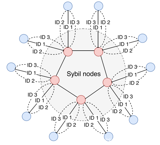 Sybil攻击以Sybil一书的主题命名,并在2002年由Microsoft研究的Brian Zill提出[5]。 一个敌对的对等方可以通过创建大量虚假身份来欺骗系统,从而破坏其信任和冗余机制,从而对区块链进行攻击。 2003年,Karlof和Wagner发现Sybil攻击是对作为分布式网络的无线传感器网络的潜在威胁[6]。从那以后Sybil攻击被许多研究人员证明是对P2P网络系统的巨大威胁。 Bissias等提出了一种名为Xim[7]的混合解决方案来防止这种攻击。 在[8]中,BitFury Group得出结论,在权益证明(POS)和工作量证明(PoW)区块链系统中Sybil攻击都可能成功。