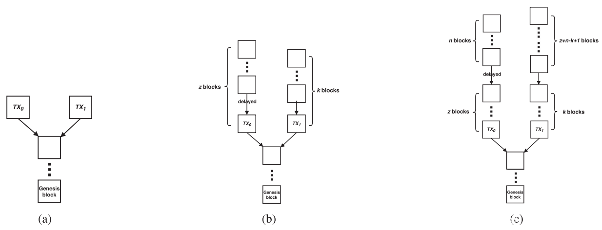 双花攻击是对加密货币网络的潜在威胁。 例如在比特币中,攻击者创建了交易TXA,该交易从未花费的交易输出(UTXO)释放给商家。 TXA将被记录在主链中,诚实的矿工然后开始挖矿。在将TXA添加到主链中的新区块之前,攻击者会秘密挖掘自己的分支,该分支紧随当前最新的区块。然后,攻击者从同一UTXO创建另一个与TXA冲突的事务T XB,攻击者分支中包含的TXB将资金转移到攻击者的第二地址。一旦商家收到足够的针对TXA的冻结确认,便将货物发送给该攻击者。攻击者继续挖掘,一旦他使自己的链比主链长,攻击者便将自己的分支广播到网络。由于最长链规则,其他矿工最终同意了此攻击者的分支链,因此,将TXA替换为TXB。因此,攻击者同时获得商品和资金。
