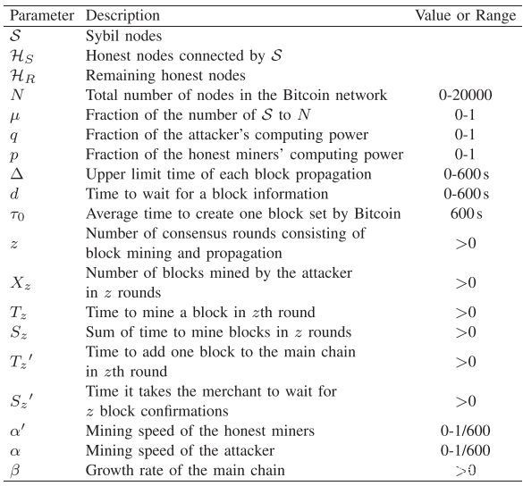 另一方面,由于S的计算能力为零,因此只有攻击者自己的节点才参与私有链的创建。假设攻击者的计算能力占网络总计算能力的q。因此,诚实的矿工在总计算能力中所占的比例为p=1-q。假设q<p并且每个诚实节点具有相同的计算能力,还假设攻击者节点和诚实节点的计算能力与其挖掘速度呈正相关。在攻击过程中,攻击者无法更改其计算能力或破坏PoW规则以加快其挖掘速度。相反,攻击者只是利用Sybil节点来影响块传播过程。下表表列出了此攻击模型的环境参数。