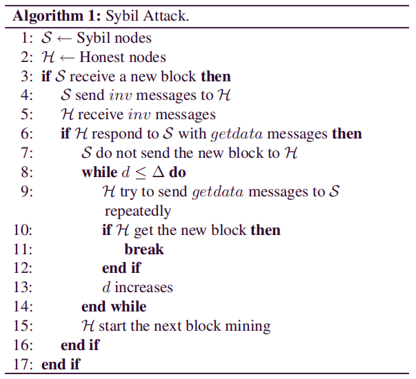 之后,私有链与主链进行一次挖矿竞争。攻击者利用他的Sybil节点发起Sybil攻击,以延迟主链的增长率。请注意,这些Sybil节点仅影响区块链共识的传播速度,而不是参与区块挖掘。如上,时间复杂度为O(Δ)的算法1描述了一轮块传播期间Sybil攻击的过程。攻击中的块传播规则遵循第gossip协议。一旦Sybil节点接收到一个新开采的块,这些Sybil节点的每个假身份将向每个连接的诚实节点发送一条inv消息。接收inv消息的诚实节点将getdata消息发送到这些Sybil节点。这里的技巧是这些Sybil节点不会将新的块信息发送到这些诚实节点,因此,块传播的一部分是“frozen”。