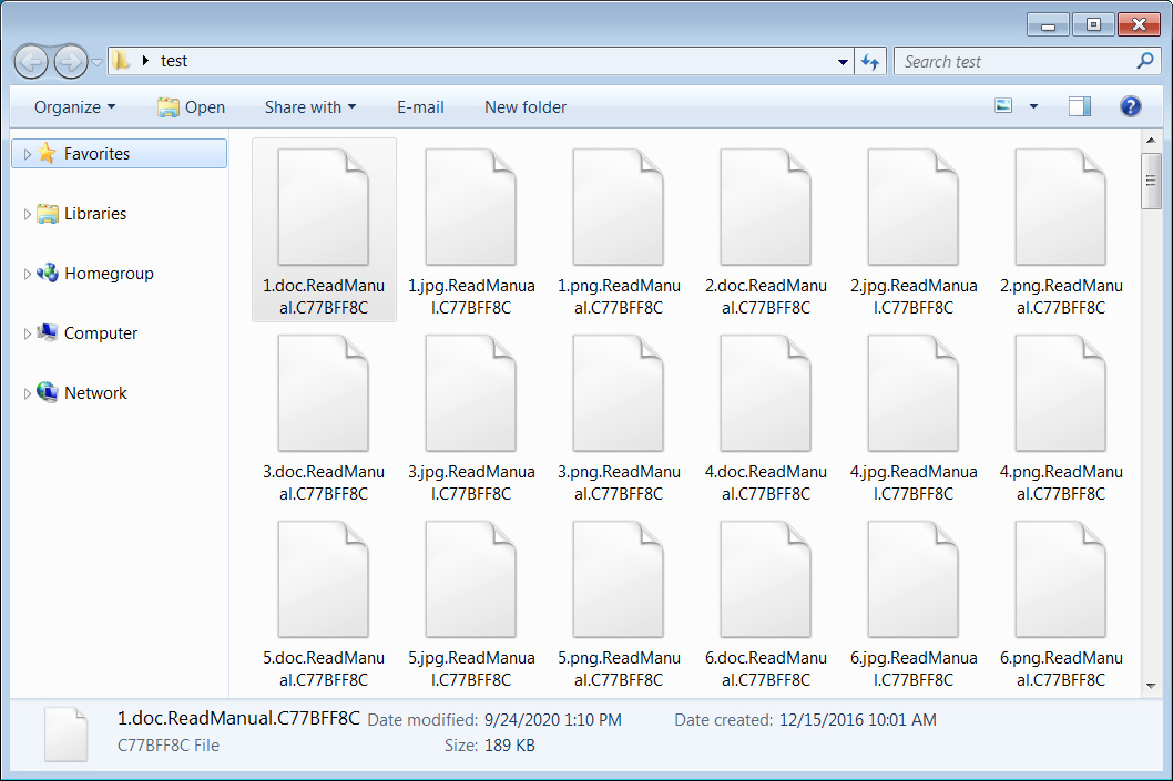 根据我们的分析,当加密文件时,勒索软件会以.Readmanual.ID的格式添加扩展名。例如,1.doc将被加密并重新命名为1.doc.ReadManual.C77BFF8C,如下图所示。