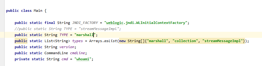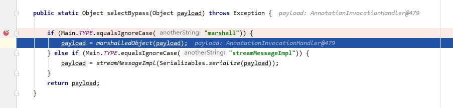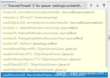 可以看到,这里根据TYPE选择了marshall类型的包装,从这里我们可以猜测这个漏洞对于CVE-2015-4852的防护黑名单的绕过是基于额外封装的,黑名单限制了那三个反序列化点,不让它们对那几个关键类进行反序列化,于是又找了另一个包的类,进行了二次封装,通过反序列化这个marshall对象触发构造好的AnnotationInvocationHandler。这一点在下面漏洞的调试中我们可以有一个比较直观的感受。