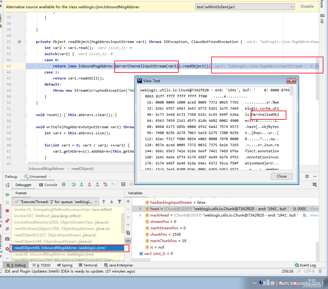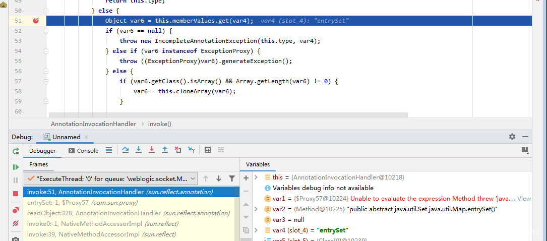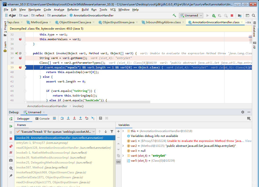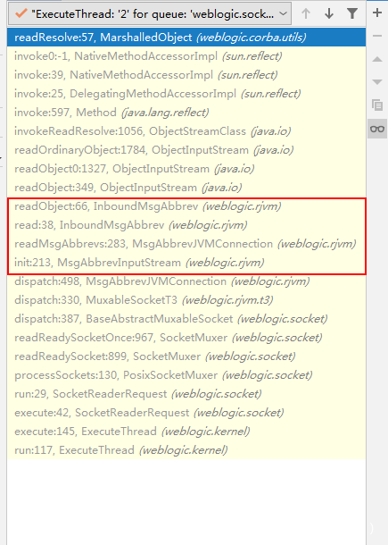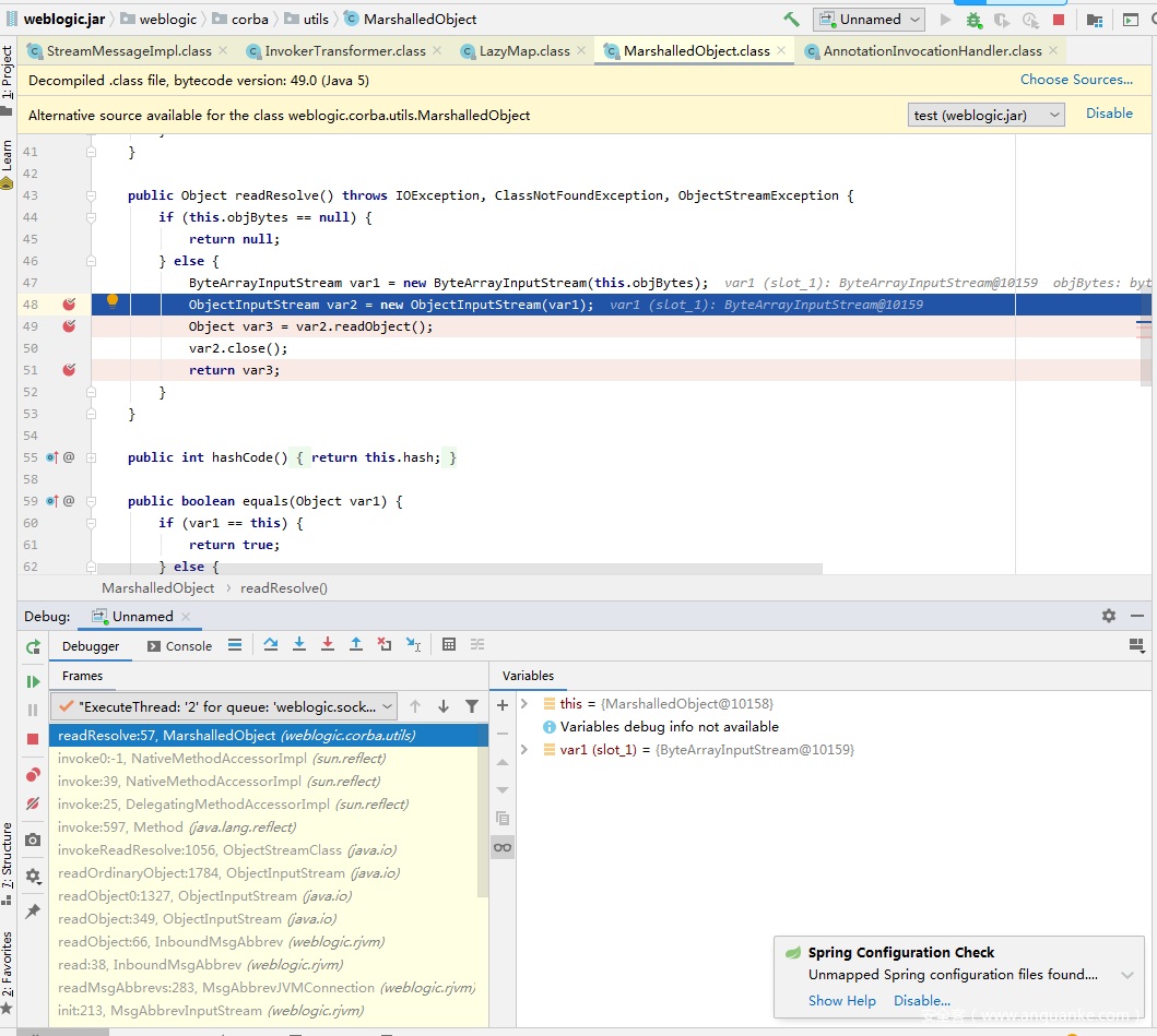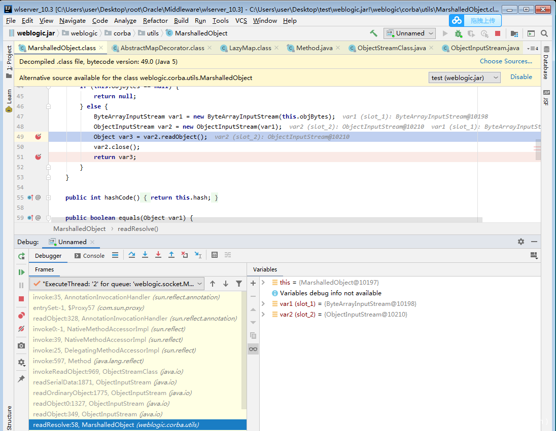 个人认为,这里是整个调试过程中的一个关键点。作为CVE-2015-4852中黑名单做保护的一个点,ServerChannelInputStream对一些关键类的反序列化做了限制,但此时var1是一个MarshallObject(或曰是一个Marshall外壳加AnnotationInvocationHandler的内里),并不在黑名单所限制的那几个关键的类里面,所以下面仍然可以正常的进行反序列化。
