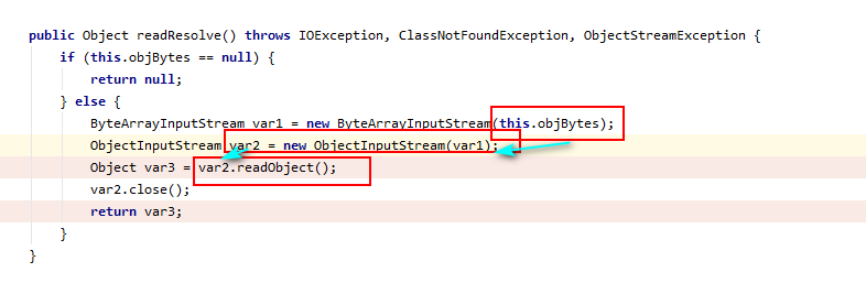 weblogic.corba.utils.MarshalledObject这个类没有实现readObject或者readExternal函数,所以在反序列化的时候采用ObjectInputStream的默认流程。但这个流程会调用辅助类ObjectStreamClass的invokeReadResolve函数,后者会调用MarshalledObject的readResolve函数,查看readResolve我们会发现,readResolve中有readObject的调用,而其参数正来自其本身的objBytes变量,如下: