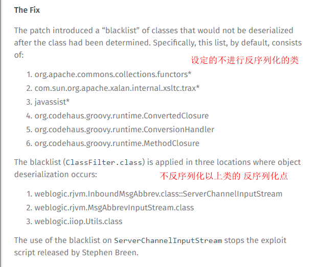 结合上一次调试过程中记录的信息,我们可以看到,这个fix阻断了CVE-2015-4852的exp中在偏底层的位置对关键类的反序列化,可以说是打断了利用链。