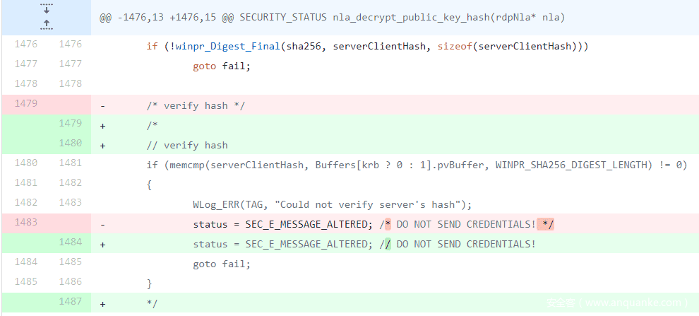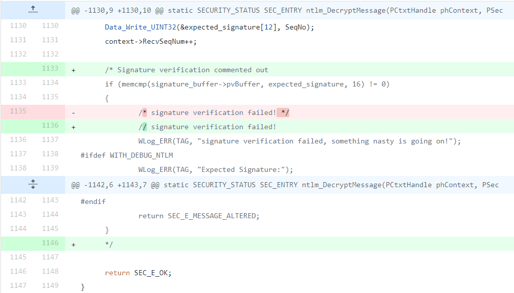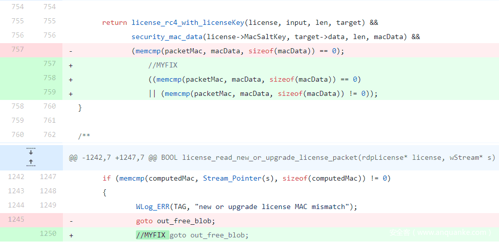 但是,出于我们的目的,这种完整性检查将带来许多阻碍,因为我们的Fuzzer会不断更改数据流字节,从而触发校验和失败,这通常会导致RDP连接中止。为了绕过这些限制,我们必须对FreeRDP的代码进行一些必要的修改。