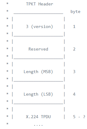 TPKT数据包(Slow-Path):TPKT报头的长度固定为4,随后的X.224 TPDU的长度至少为3个字节。因此,最小TPKT长度为7,最大TPKT长度为65535。由于TPKT长度包括TPKT报头(4个字节),因此,X.224 TPDU的最大长度为65531。