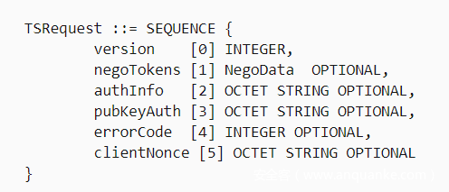 除此之外,我们还必须考虑启用NLA模式的情况。网络级身份验证(NLA)是RDP的一项功能,要求连接的用户在与服务器建立会话之前进行身份验证。在这些情况下,我们还必须知道TSRequest结构,具体如下所示: