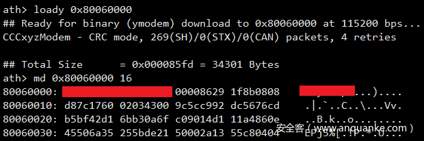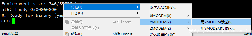 命令格式为 loady address,然后使用 YMODEM 发送修改后的文件。