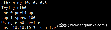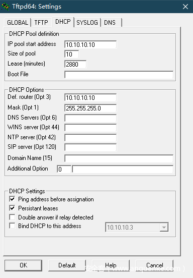 host 10.10.10.3 存活说明连接成功。另外,还准备一个 TFTP 服务器,刚开始用的 FileZilla,不行发现还需要 DHCP 服务器,有找个dhcpsrv ,最后发现还是 TFTPD比较好用。打开就能用,配置也很简单,FTP 设置一下路径,DHCP 需要设置IP等,如下图。
