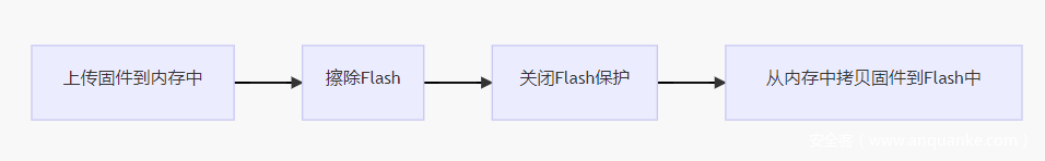 搞 IOT 安全的并不是都熟悉嵌入式开发,搞嵌入式开发的不一定理解我们的需求,问了搞嵌入式的朋友他会不会。我是第一次通过 U-Boot 刷写固件,由于缺乏基础知识走了不少弯路,写这篇文章的目的也是帮助有同样需求的人少走弯路。U-Boot 固件刷写不能直接写入到 Flash 中,需要按照下图的流程操作。