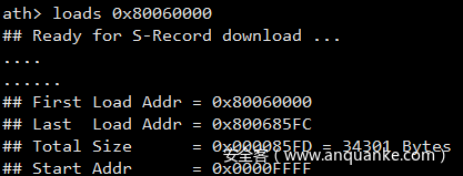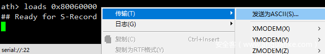 S-Record文件中的数据都是以ASCII码的格式存储,正好使用 Xshell ASCII 字符传输修改后的文件。命令格式为 loads address。