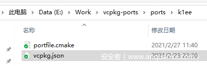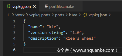 在ports文件夹里,我们按照vcpkg的结构,创建k1ee文件夹,表示k1ee库。接下来还需要创建vcpkg.json以及portfile.cmake