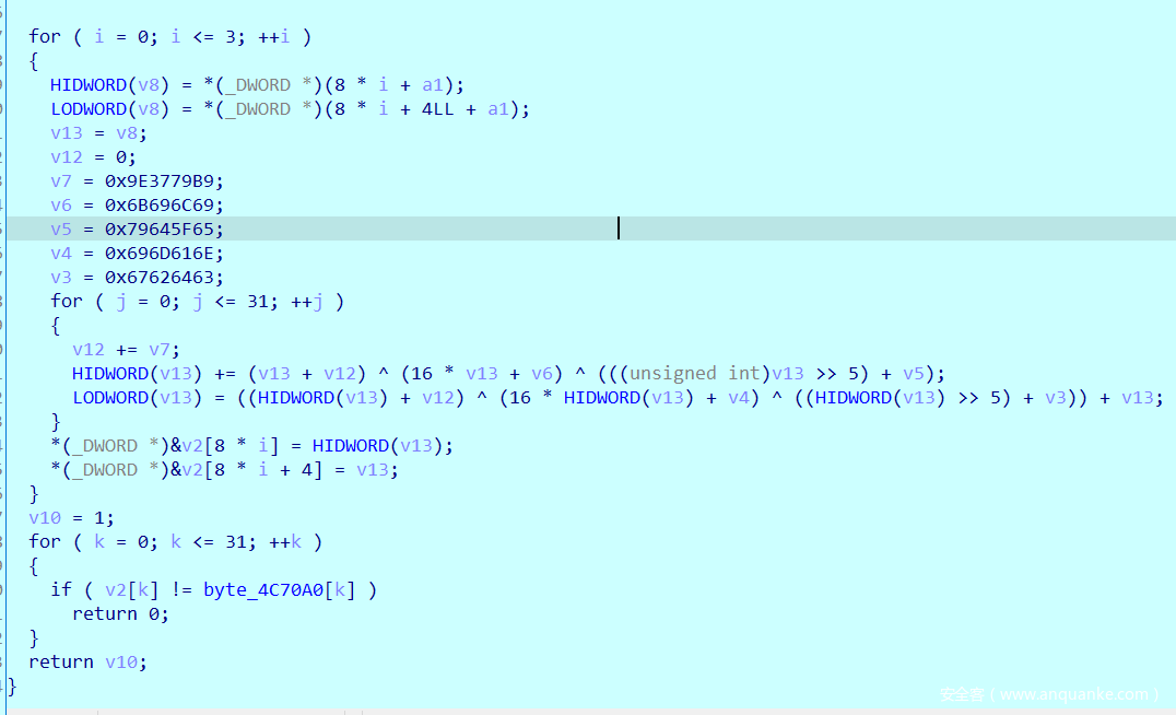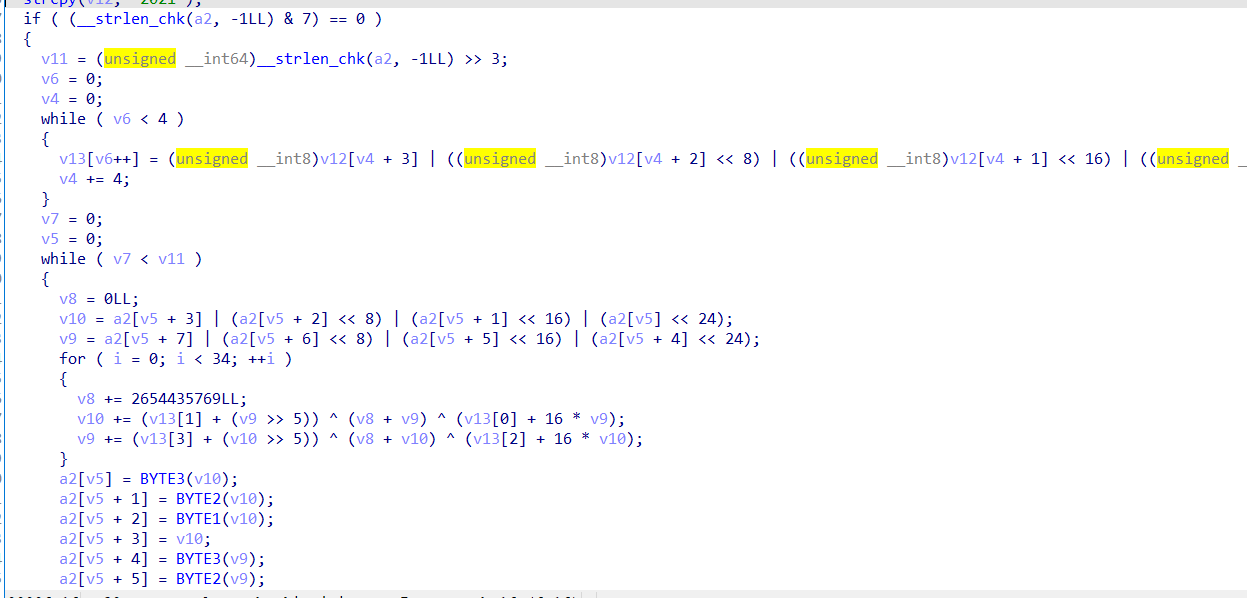 - patch之后可以查看伪代码了,就是个 TEA 加密