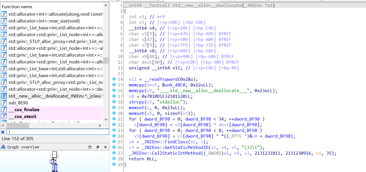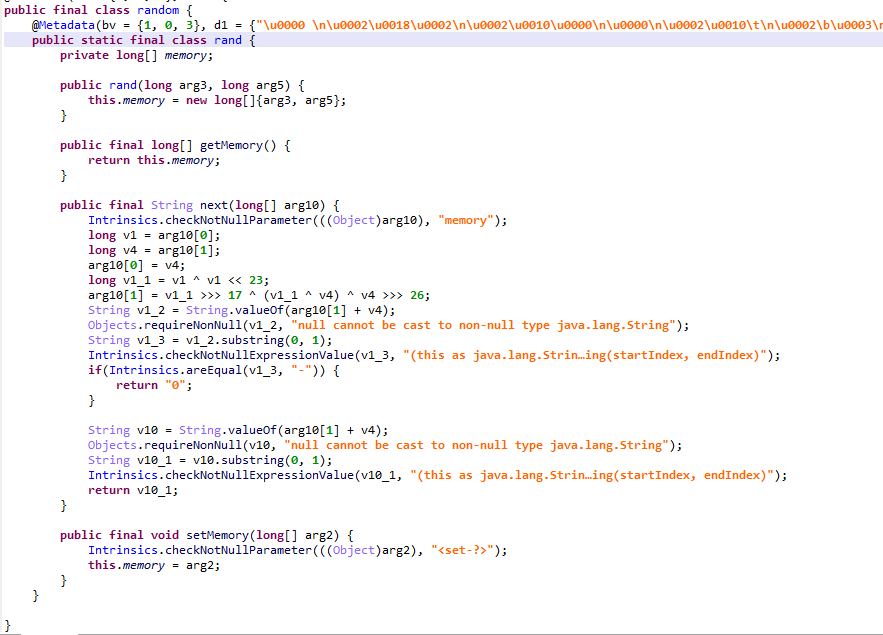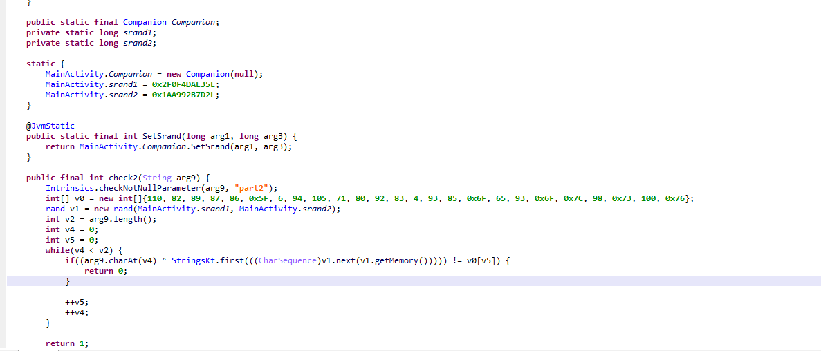 再次进行了字符串隐藏,主逻辑是在so层用JNI提供的接口调用SetSrand,重置随机数种子,在这里设置为两个长整型2131231011和2131230916