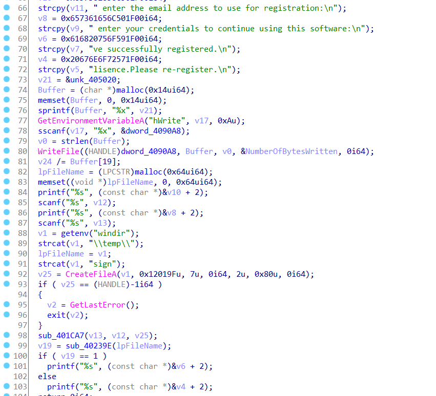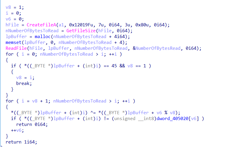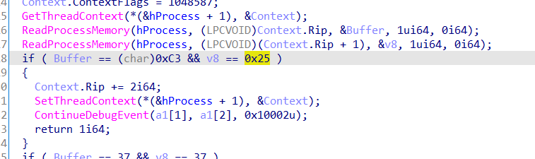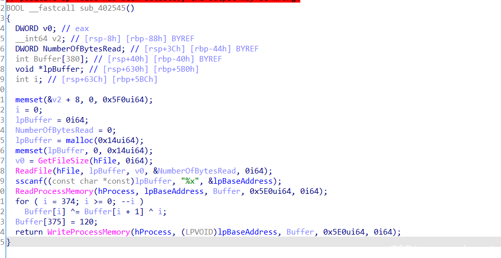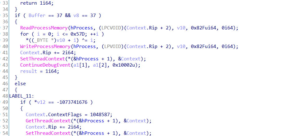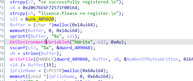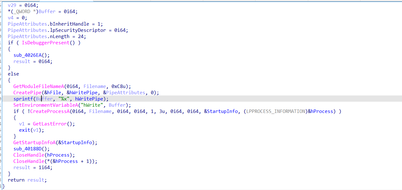子进程在这里活得自己进程check数组的储存位置后利用v24/=Buffer[19]触发除零异常,在这之前讲内存地址用writefile写到管道中,子进程捕获异常后获取地址,修改内存位置的值,处理异常,子程序继续执行,但是check数组已被改变。
