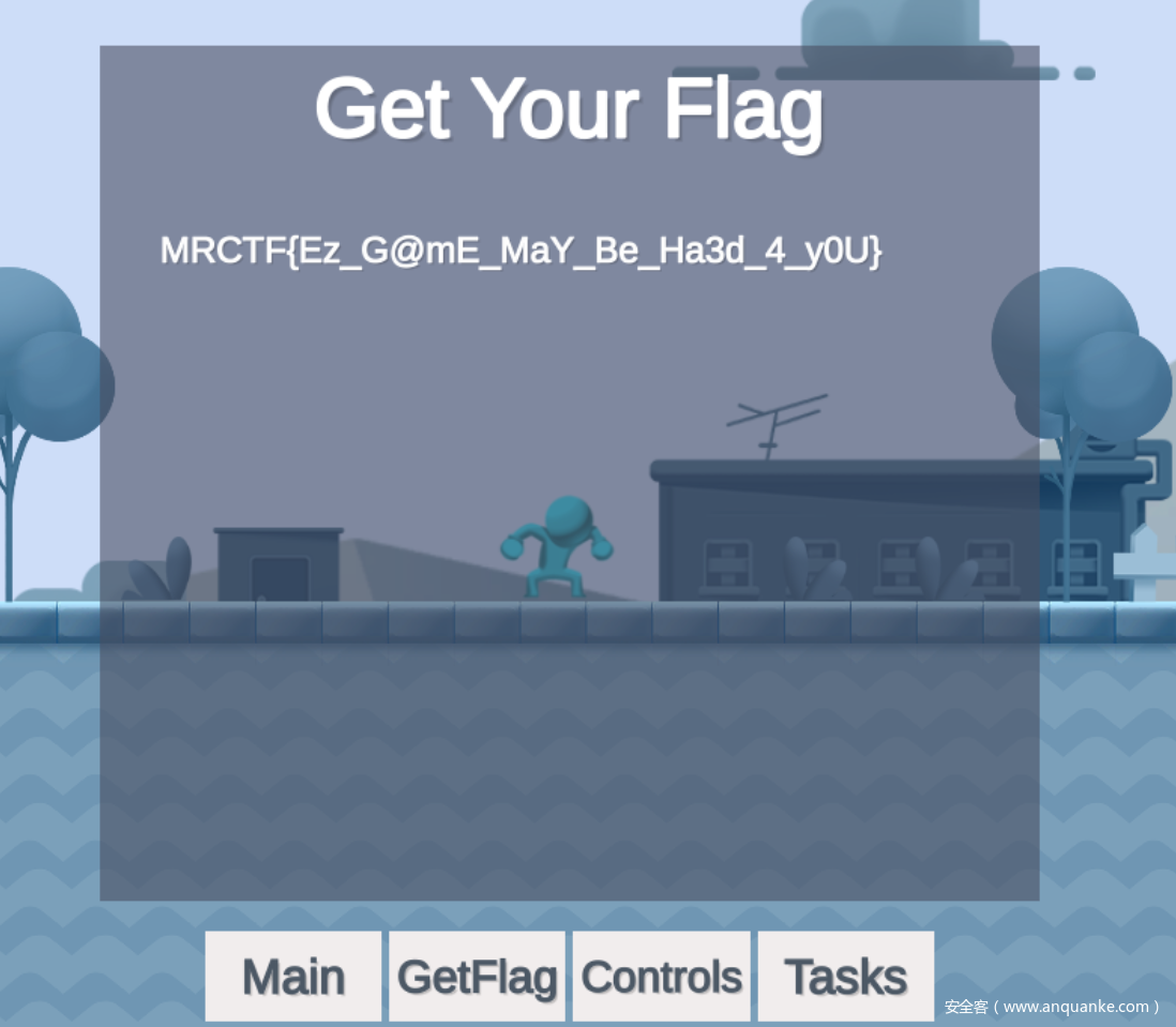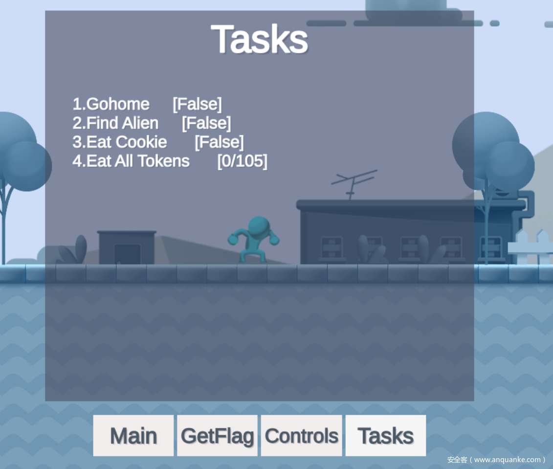 先按ESC打开菜单页面,找到有GetFlag按钮,然后必然是拿不到Flag的,后面还有Tasks,显示需要干什么