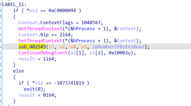 处理除零异常,此处sub_402545进行修改内存,进行了加花,patch即可,改call+ret+popq为jmp即可