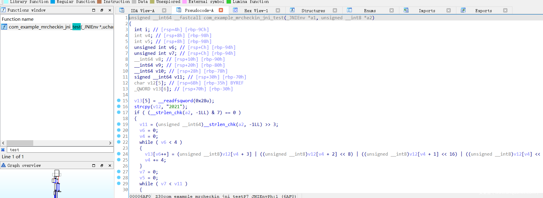 随便提取一个架构的so进行分析,按理平时一般会搜索test就能找到函数,我在这里做一个混淆替换