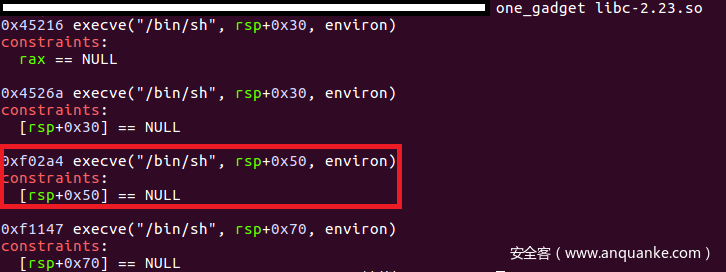 其中one_gadget可以通过工具从lib.so.6(我的版本libc-2.23.so)中帮我们获取(one_gadget工具),加上泄露的libc基址即one_gadget在内存中的虚拟地址。