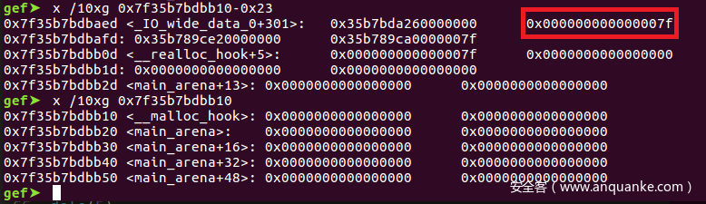 由于fastbin在malloc过程中,为了满足fastbin_index检查,我们通过gdb调试找到__malloc_hook-0x23处正好有一个size=0x7f的位置,如下图所示。