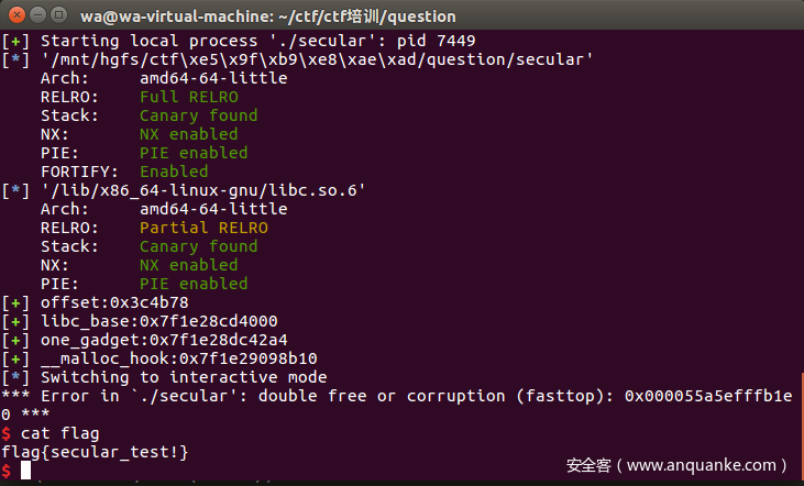 因为PIE开启,首先得利用Unsotred bin泄露出Unsorted(av),其跟libc基址的偏移是固定的,可以通过调试即libc的地址,从而得到libc的基址,继而可以根据给出的lib.so.6文件中__malloc_hook的偏移计算出其在内存中的虚拟地址;由于RelRO保护为Full因此got表无法改写,而利用double free可以实现Fastbin attack,将0x70大小chunk申请至__malloc_hook附近,从而将__malloc_hook的内容改为one_gadget地址,最终程序调用malloc函数时会通过__malloc_hook劫持程序流程执行one_gadget。