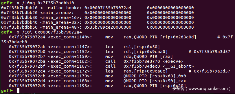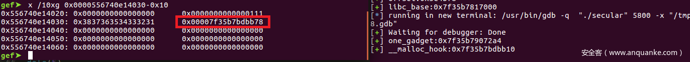 此时申请的9号chunk位于__malloc_hook-0x13-0x10的位置,gdb调试查看,发现__malloc_hook被改写为one_gadget,如下图所示。