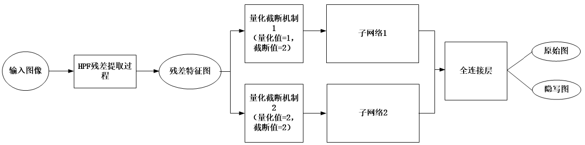 本文提出了一个隐写分析模型,它的网络架构可被分为两阶段。在第一阶段中,模型模拟空域富模型的特征提取方式提取出输入图像中的残差特征信息,并使用量化截断机制约束了这些残差特征值在一个固定的范围内。在第二阶段中,本文构建了两个并行的不同类型的子卷积神经网络提取出多样化的特征信息。基本的网络架构如下图所示。