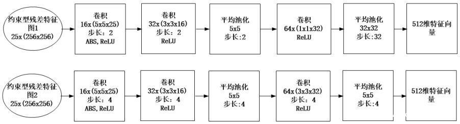 第二阶段是由两个并列的子卷积神经网络组成的,网络中的参数均随着模型的训练而被优化。在第二阶段中,每个子网络对应一个约束型残差特征图,经实验验证,最终应用约束型残差特征图1作为子卷积神经网络1的输入信息,应用约束型残差特征图2作为子卷积神经网络2的输入信息。这两种子卷积神经网络的网络结构如下图所示,由上到下分别为子卷积神经网络1和子卷积神经网络2。
