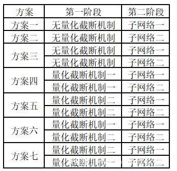 确定在当前模式下的最佳隐写分析模型。在这一阶段,我们设计不同的方案来验证量化截断机制的特点、不同子卷积神经网络的特征、不同量化阶段方法和子网络组合的性能。本文设计了七个方案,称为方案一到方案七,它们的详细设计信息如下表所示。