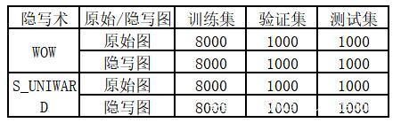 本文的数据集是10000张BOWS2灰度图像集。对于数据集的处理,本文首先应用了matlab的imresize()函数将大小为512×512的灰度图像缩放为大小为256×256的低分辨率图像集,以适应现有GPU的内存容量,再采用了WOW、S_UNIWARD隐写术方法分别对BOWS灰度图进行隐写操作从而生成对应的隐写图像集。对于每种隐写类型的完整的10000对原始-隐写图图像集,本文均采用了训练集、验证集和测试集的比例8:1:1来对其进行随机划分,最终得到的数据集如下表所示。